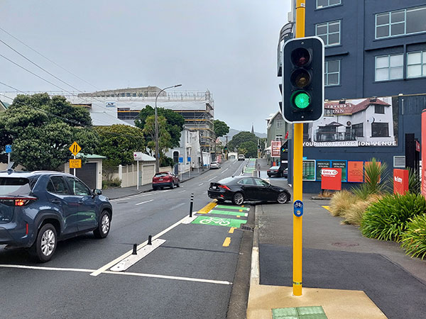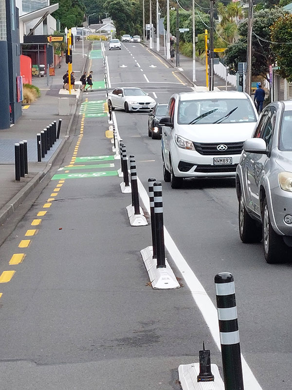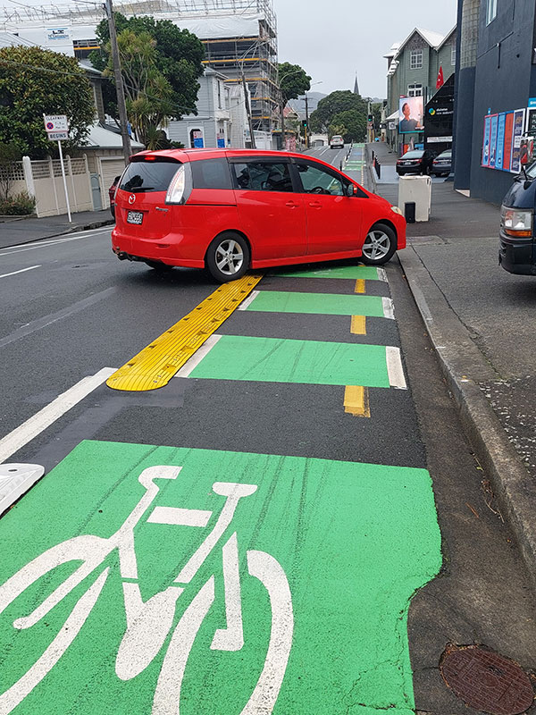 Some cyclists choose the vehicle carriage-way as the safer option to ride downhill. This avoids being channelled into this conflict zone with constrained exit options when drivers don’t see them, or mis-judge the pace of an approaching cycle down the ‘protected’ cycle lane.